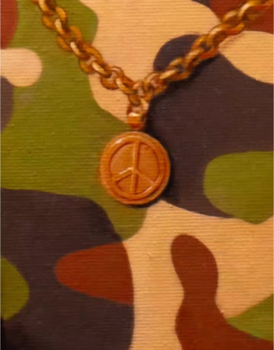 Das Friedenszeichen um den Hals fühlt sich fast nostalgisch an - ein Symbol für einen Wert, der nicht mehr selbstverständlich ist.