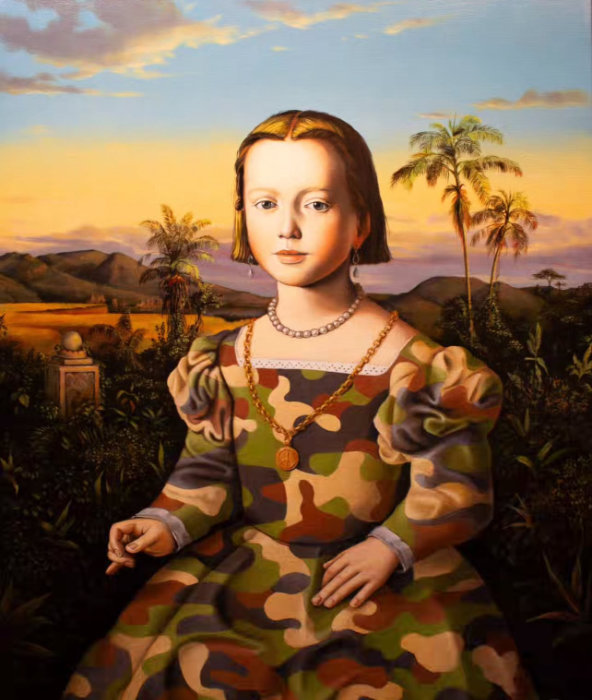 Dieses Gemälde spiegelt diesen Widerspruch visuell wider. Das Gesicht - inspiriert von der Renaissancemalerei, insbesondere Bronzino - steht für Schönheit und Harmonie. Aber das Tarnkleid deutet