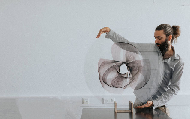 Was zunächst technisch wirkt, entfaltet im Schaffensprozess eine überraschende Lebendigkeit: Die entstehenden Linien erinnern an natürliche Prinzipien wie Wachstumsprozesse, Wellenphänomene oder planetare Bahnen. Ihre Ordnung ist nicht konstruiert, sondern ergibt sich aus dem Zusammenspiel verschiedener Schwingungen – und verweist damit auf eine tiefere Ebene von Harmonie, wie man sie auch in Musik oder Naturformen findet. Die Werke können als visuelle Resonanzräume gelesen werden, als konkrete, rhythmisch verdichtete Spuren von Bewegung.