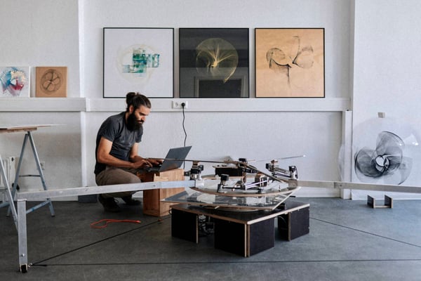 von Mensch und Maschine in generierenden Prozessen, wobei er speziell die Wechselwirkungen zwischen neuronalen Netzwerken und menschlicher Intuition untersucht, sowie das Potential dezentraler